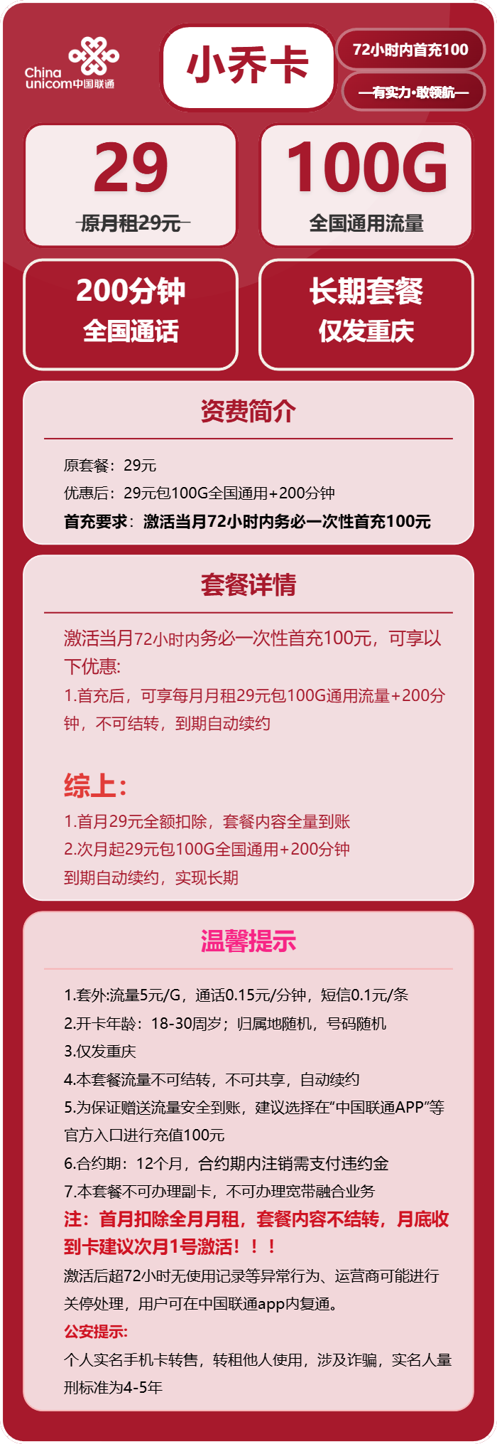 卖点: 18-30周岁 长期套餐 自动续约 仅发重庆
